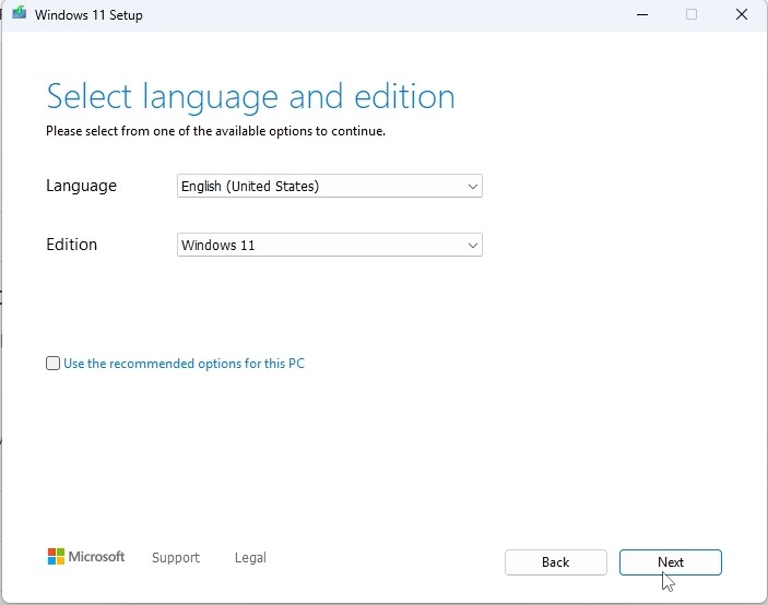 Obs! När du startar verktyget visas tre startfönster (godkännande av ändringar, godkännande av villkor, val av språk och Windows-version). Följ instruktionerna på skärmen.