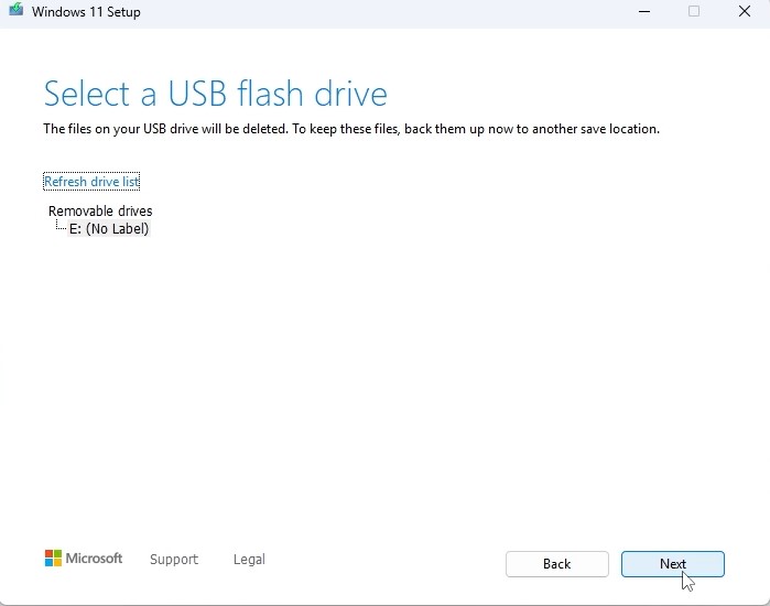 - Välj rätt enhet från listan; verktyget kommer att ladda ner och installera Windows 11 på ditt USB-minne.